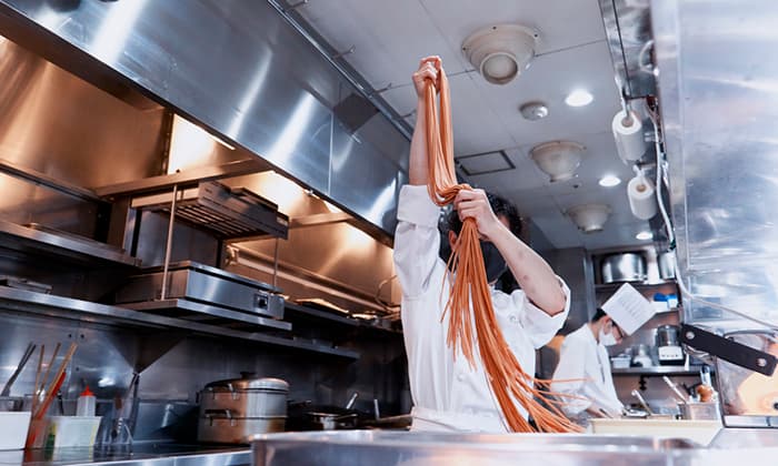 「自家製のタリオリーニにはトマトをしっかりと練り込みました。タリオリーニを最高の状態に仕上げるには、その日の気温や湿度によって水分の微妙な調整が肝となります。国産小麦を使ったもちもちとした食感はソースとの絡みもよく、トマトのかすかな酸味がソースを見事に引き立てます」。