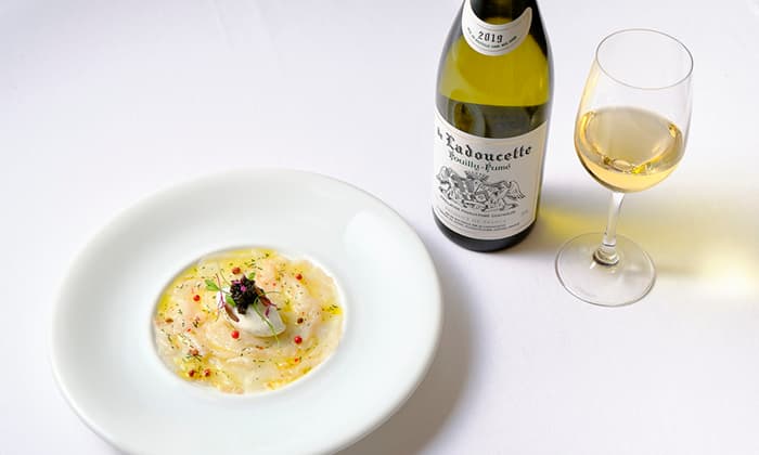 前菜の“トラフグ/キャビア/カラスミ”とソムリエ厳選の白ワイン”Pouilly Fume 2020 Ladoucette プイィ・フュメ・ラドゥセット“(*1)
