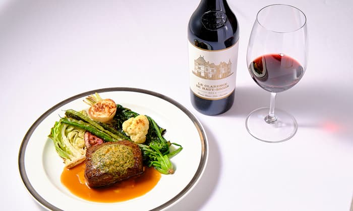 メイン料理の“四万十麦酒牛サーロインのパリステーキ カフェ・ド・パリ・ソース”とソムリエ厳選の赤ワイン“Le Clarence de Haut-Brion 2014 ル・クラレンス・ド・オー・ブリオン”(*1)