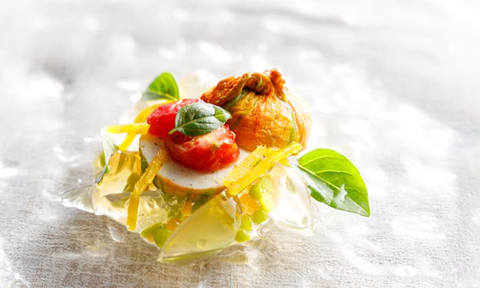 ディナーコースの一品から、「花ズッキーニ / 岩魚」